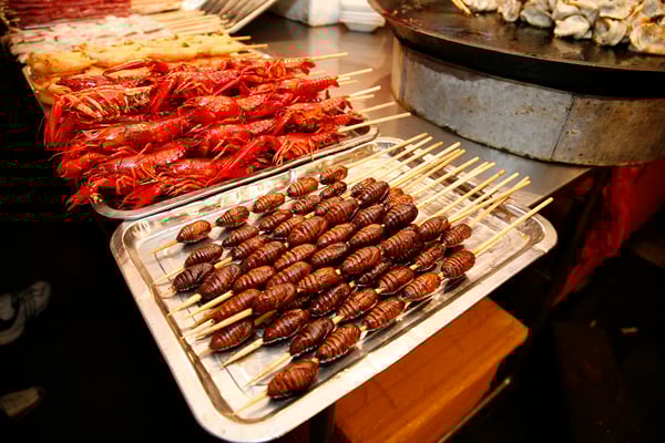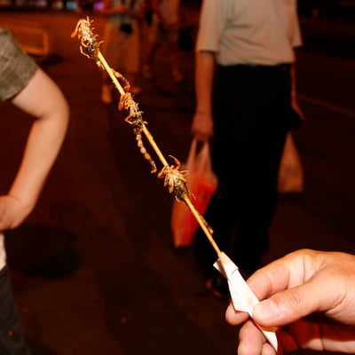 一緒に中国に行った時に、北京の屋台で売っているサソリの串焼きを面白がって食べていました。